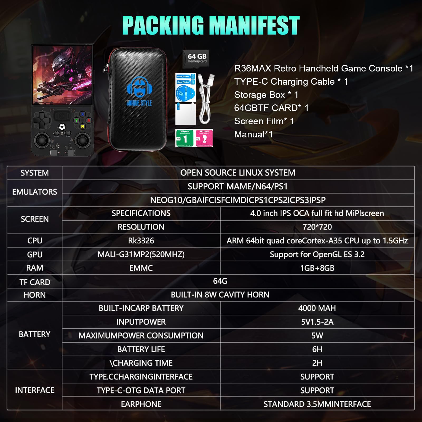 - ➨ THE ULTIMATE VINTAGE PLAYING EXPERIENCE - Relive classic gaming moments with the R36 MAX Retro Console! Featuring a 1.5GHz 64-bit RK3326 quad-core CPU and Linux system, this portable game console provides a seamless gaming experience in more than 10 retro emulators