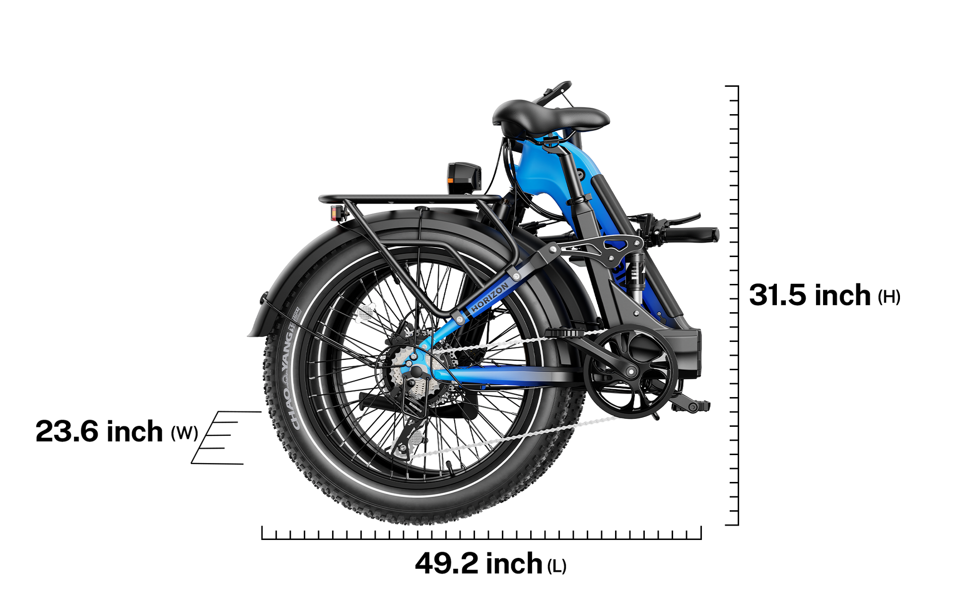- Horizon can be folded and stored in a car trunk. Its folded dimensions are 49.2"*23.6"*31.5 inch, and its unfolded dimensions are 75.6"*24.4"*46.5 inch.