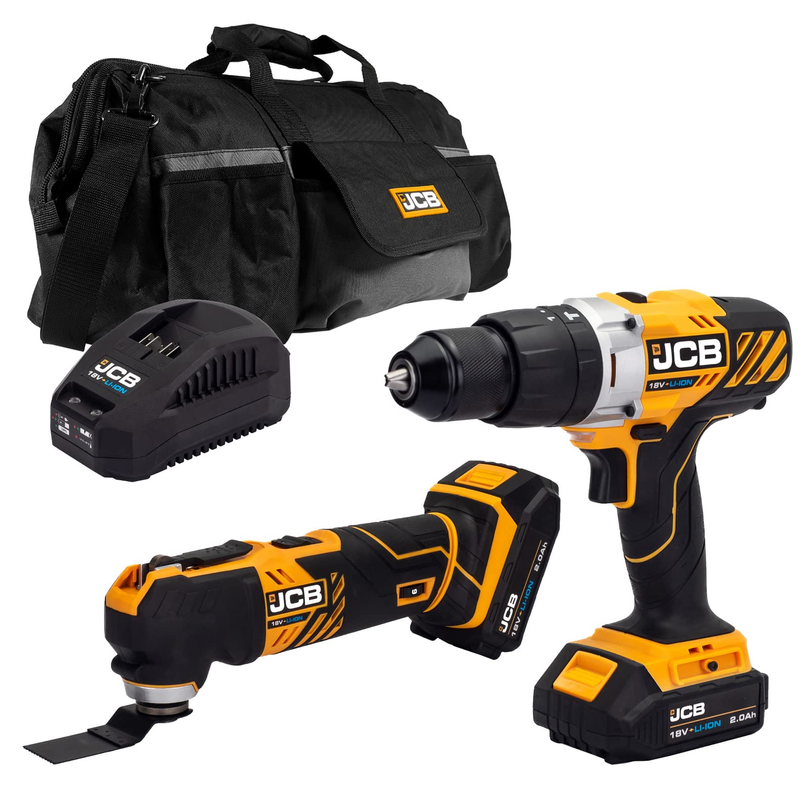 JCB 18V Cordless Combi Drill & Multi Tool, 2X 2.0Ah Battery, Fast Charger, 20" Power Tool Kit Bag