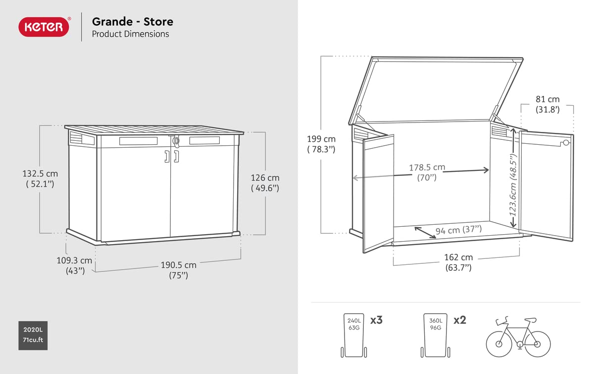 This outdoor chest with a very attractive design has a large storage capacity of 2,020 litres. Its polypropylene material, treated against UV, gives it a wood look according to Evotech technology. This box is very durable and rigid thanks to a reinforced metal frame. A ventilation grille ensures air renewal and limits the phenomenon of condensation. Practical, it will not require any maintenance. The doors are lockable to secure your tools and accessories (padlock not included). This box is resistant to cold, heat and all weather conditions. It can be painted for added customisation. Its roof supports up to 150 kg/m². The included floor protects your items from moisture and mud. Its angled access threshold will make it easier to store items with wheels. This shed comes with chains to hold and raise the bin lids. Size: 190.5 x 109.3 x 132.5 cm (L x W x H).
