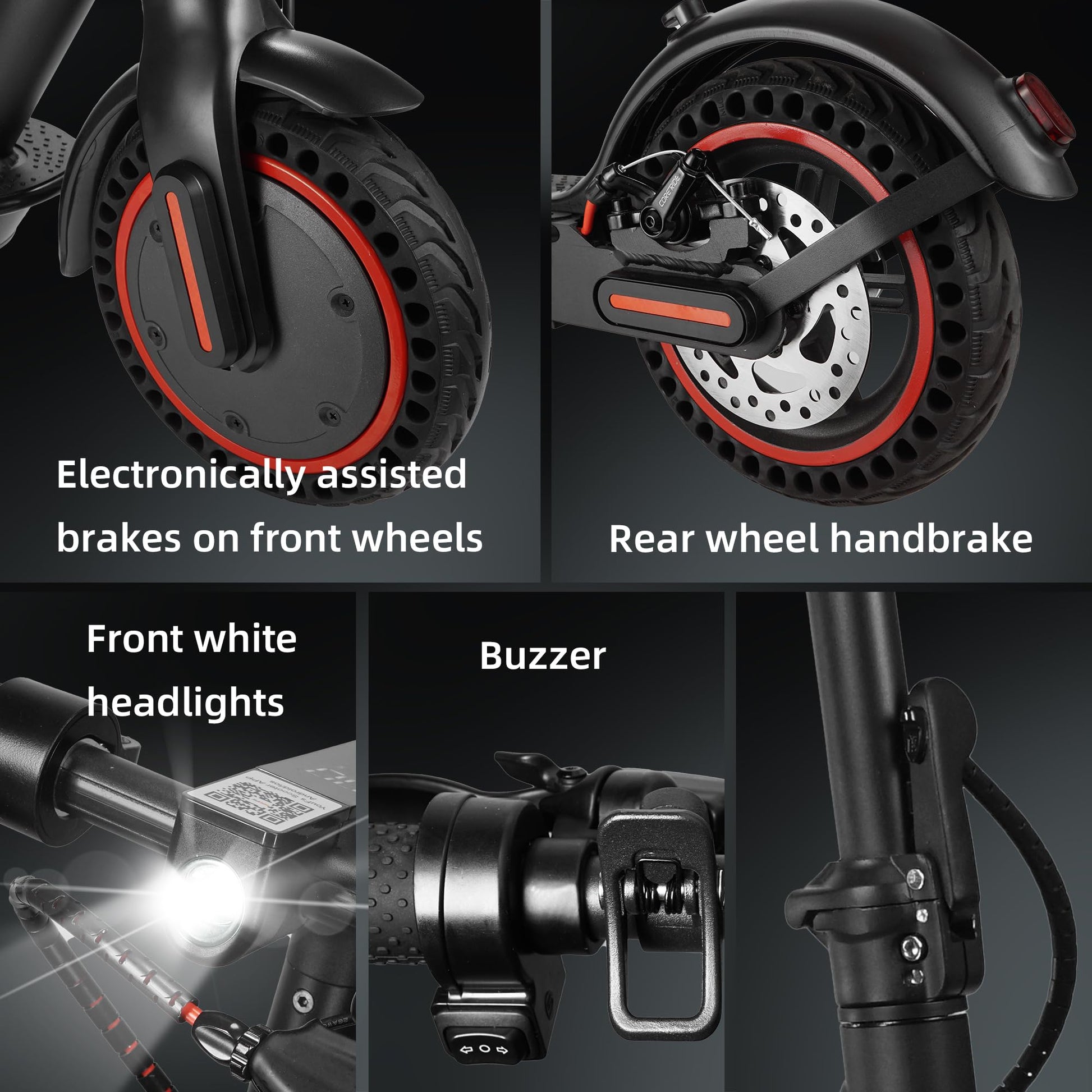 - E-ABS rear disc brake system and front electronic auxiliary braking system, plus robust puncture proof tire design, make driving safer. The electric scooter is also equipped with an LED front light and a rear brake warning light, to allow safe driving, especially at night.