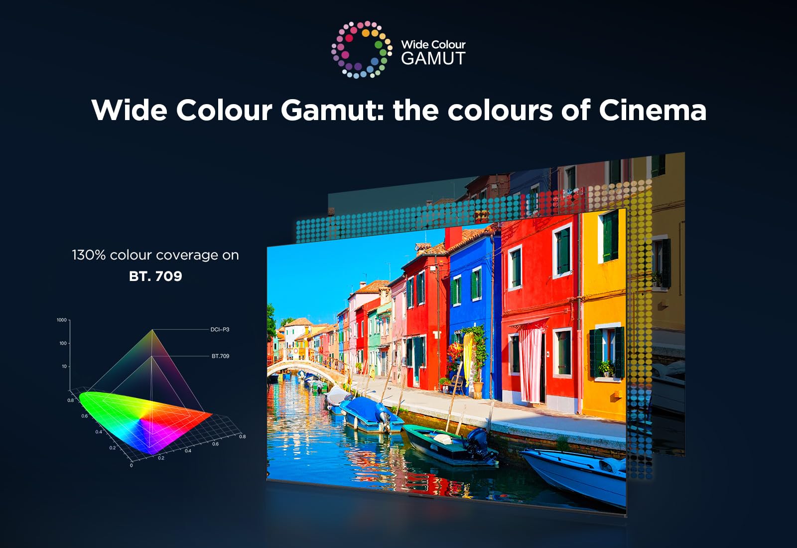 - Wide Colour Gamut 93% BT.709】Discover the incredible variety of intense and ultra realistic colours of digital cinema in your living room thanks to the Wide Colour Gamut that reproduces 30% purer and richer colours than traditional LED screens.