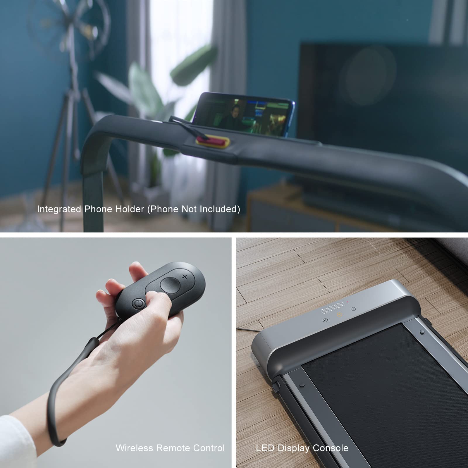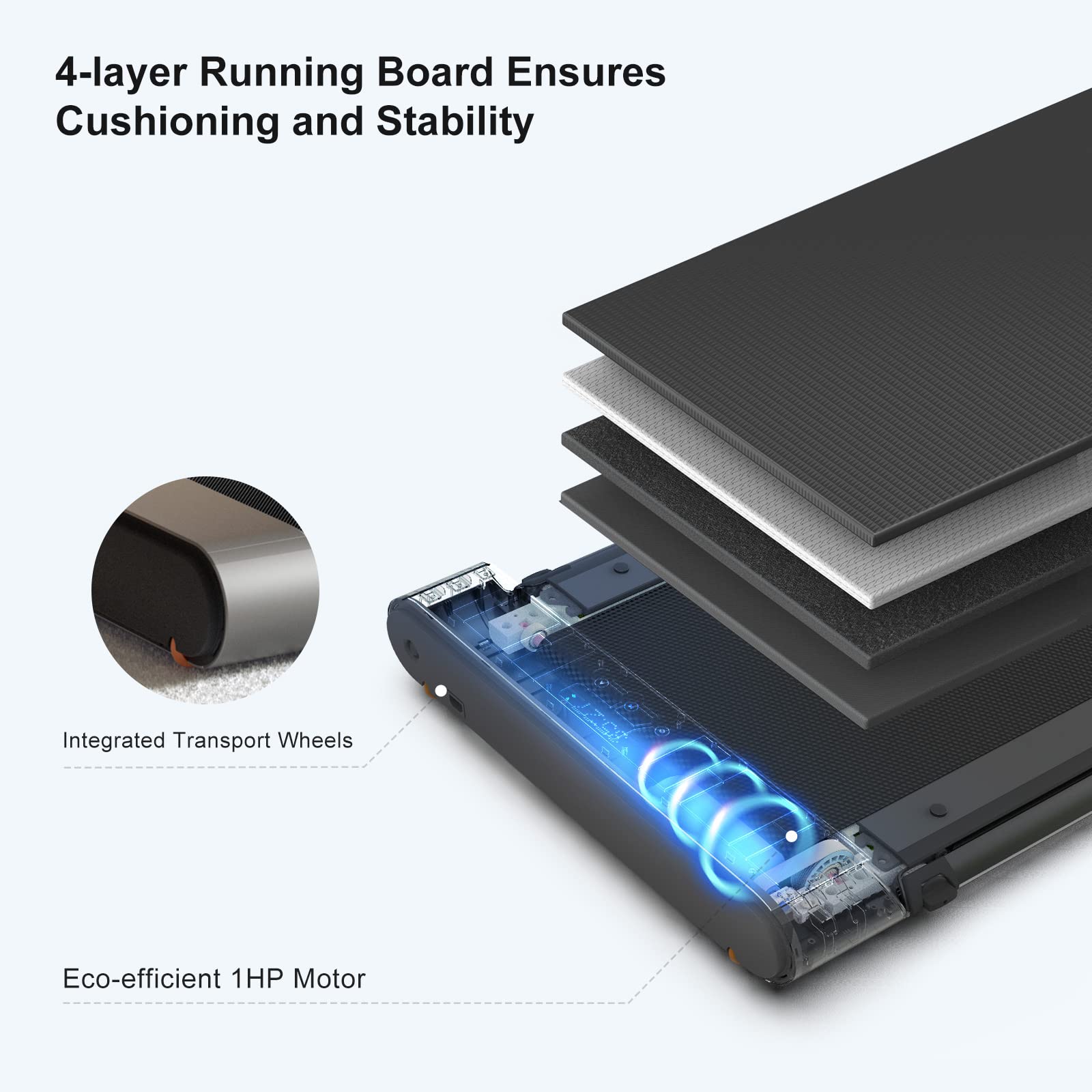 - Designed for Comfort and Safety - Track your stats with the bright LED display, showing speed, distance, and workout duration. With a spacious 44 cm x 120 cm running area and a cushioned 4-layer running belt, the walking pad foldable R1 Pro reduces joint impact for a more comfortable run. Safety features include a child lock, speed limiter, emergency stop, and auto-standby, so you can feel confident using it at home.